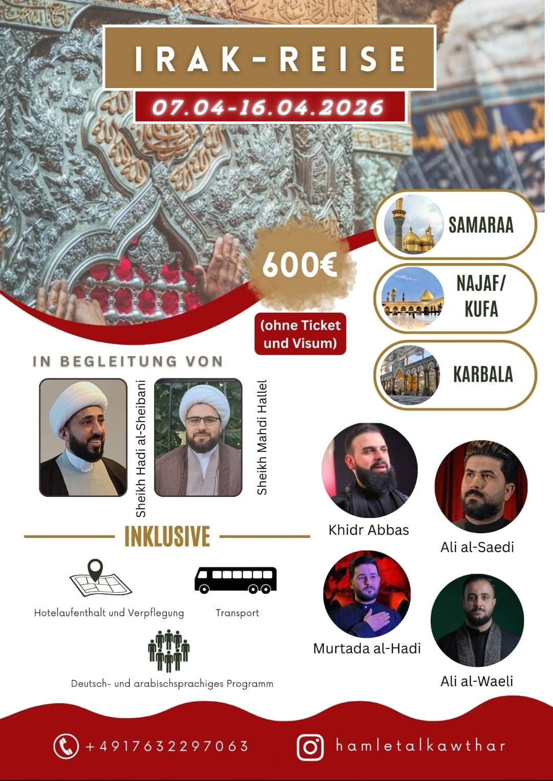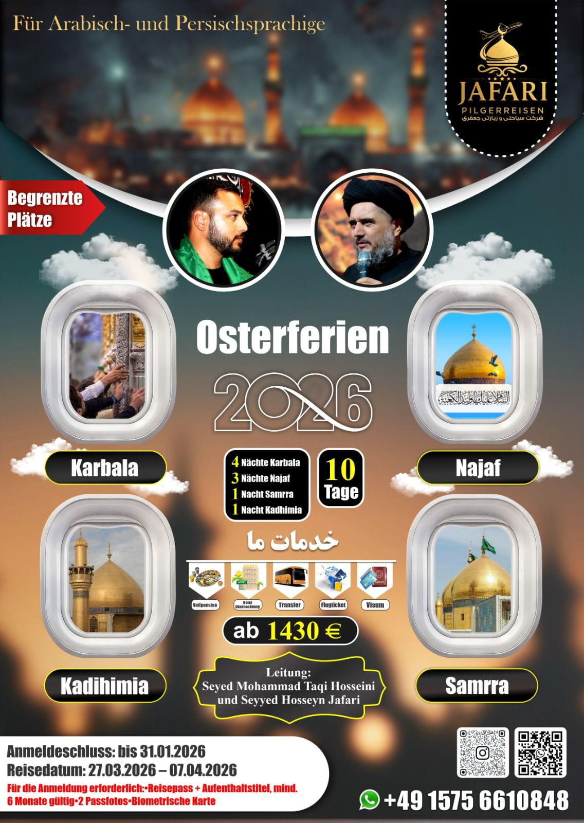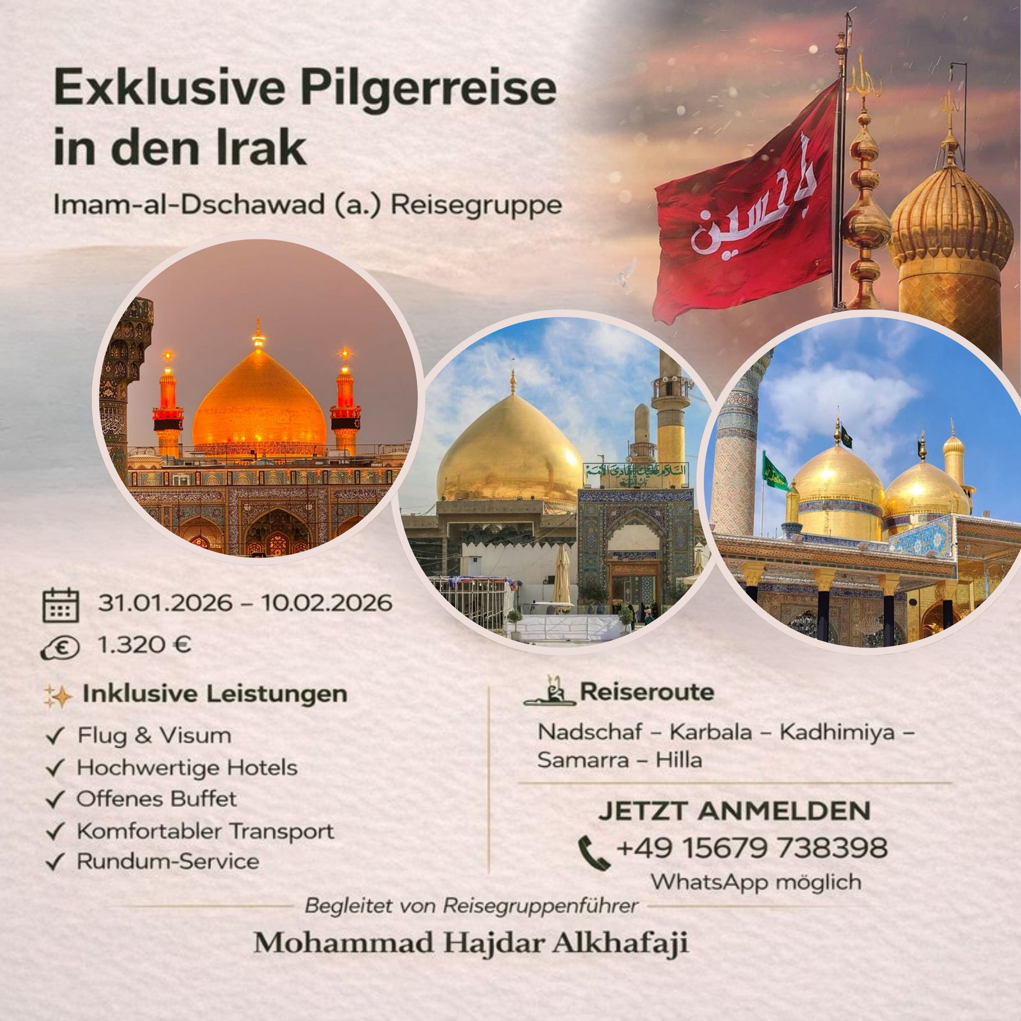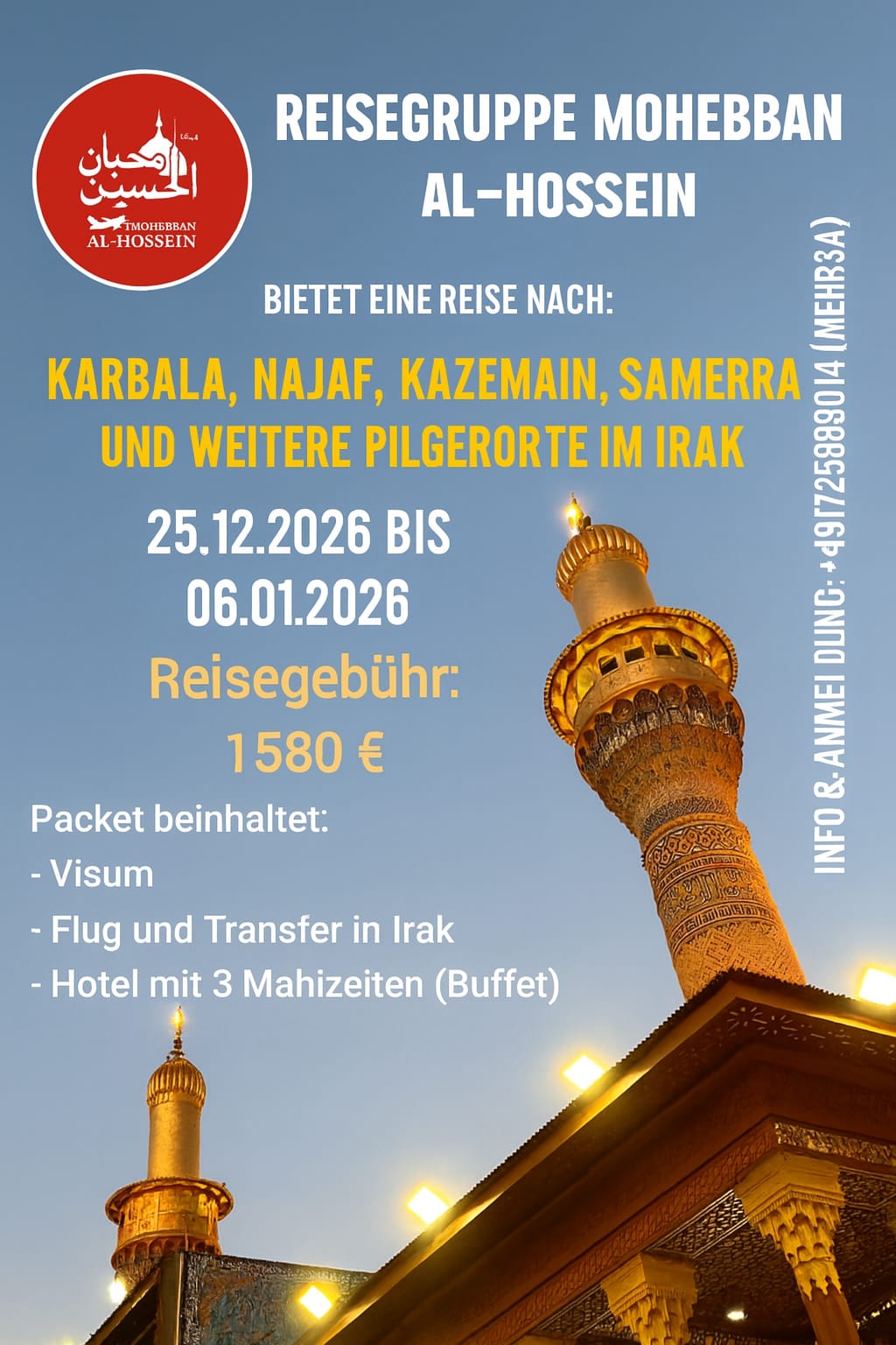 Irak Ziyarat 2026 – Hier findest du die Flyer der Organisationen für die Pilgerreisen nach Irak für das Jahr 2026.